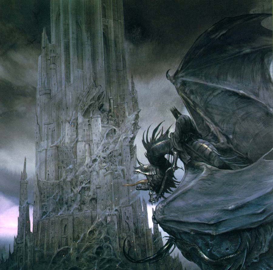 With their return to Mordor, Sauron bestowed upon the Nazgul fell beasts as their new mounts. Sauron used the lesser eight Nazgul for his reconnaissance work and dirty deeds that needed power. The Witch-king, however, returned to Minas Morgul and resumed the role of commander of Sauron’s forces. He then began battles to capture Osgiliath, finally issuing the war command from Morgul with a great army. However, at the bridge over Morgulduin he paused, feeling the Ring nearby.